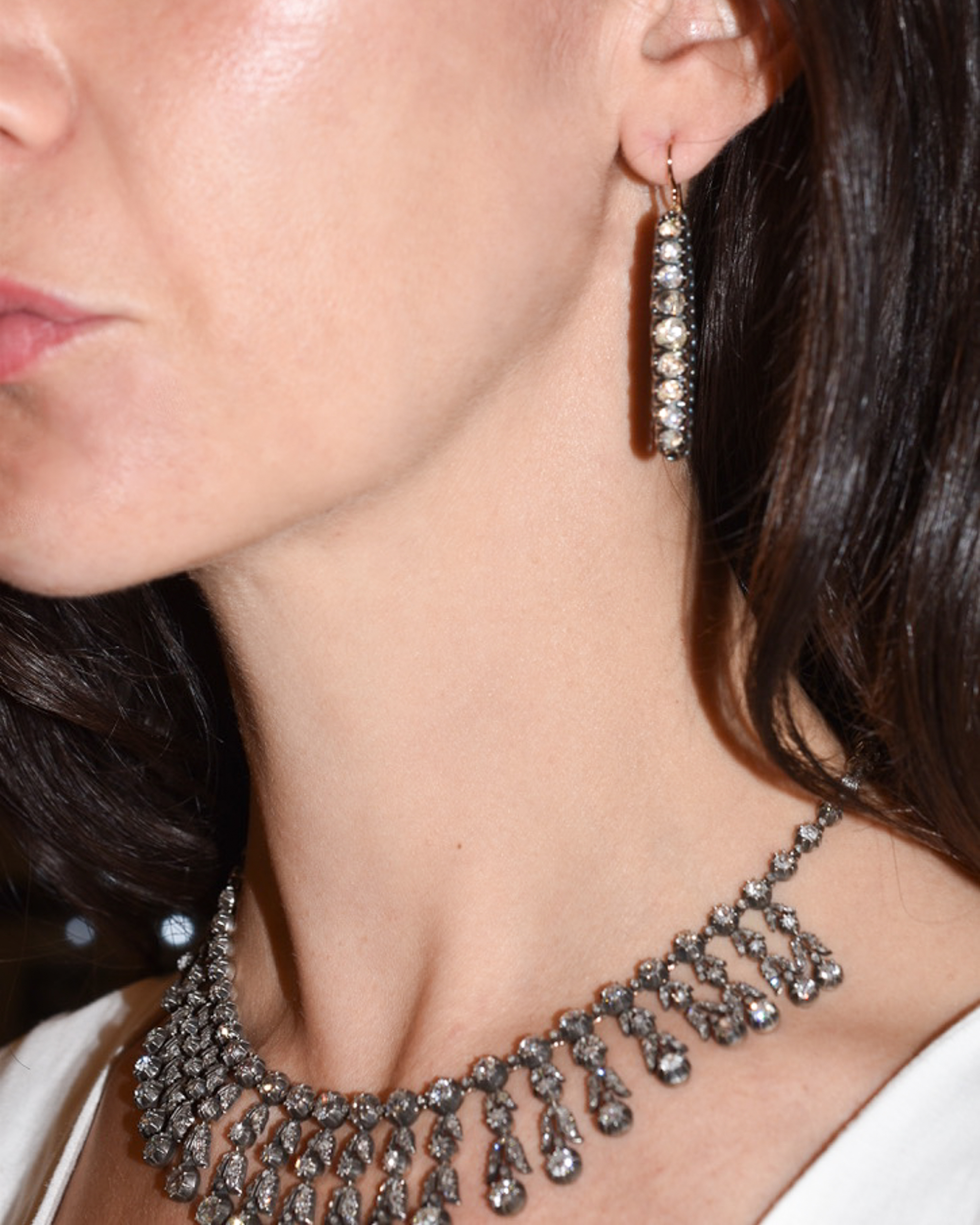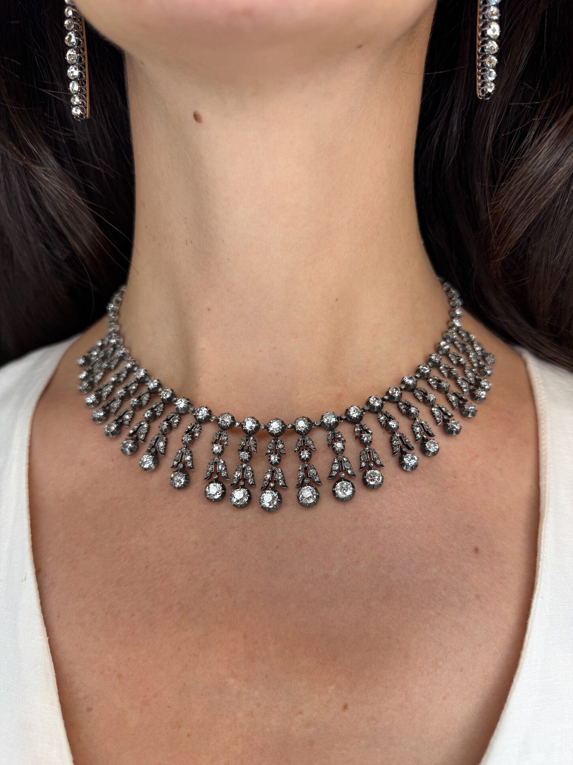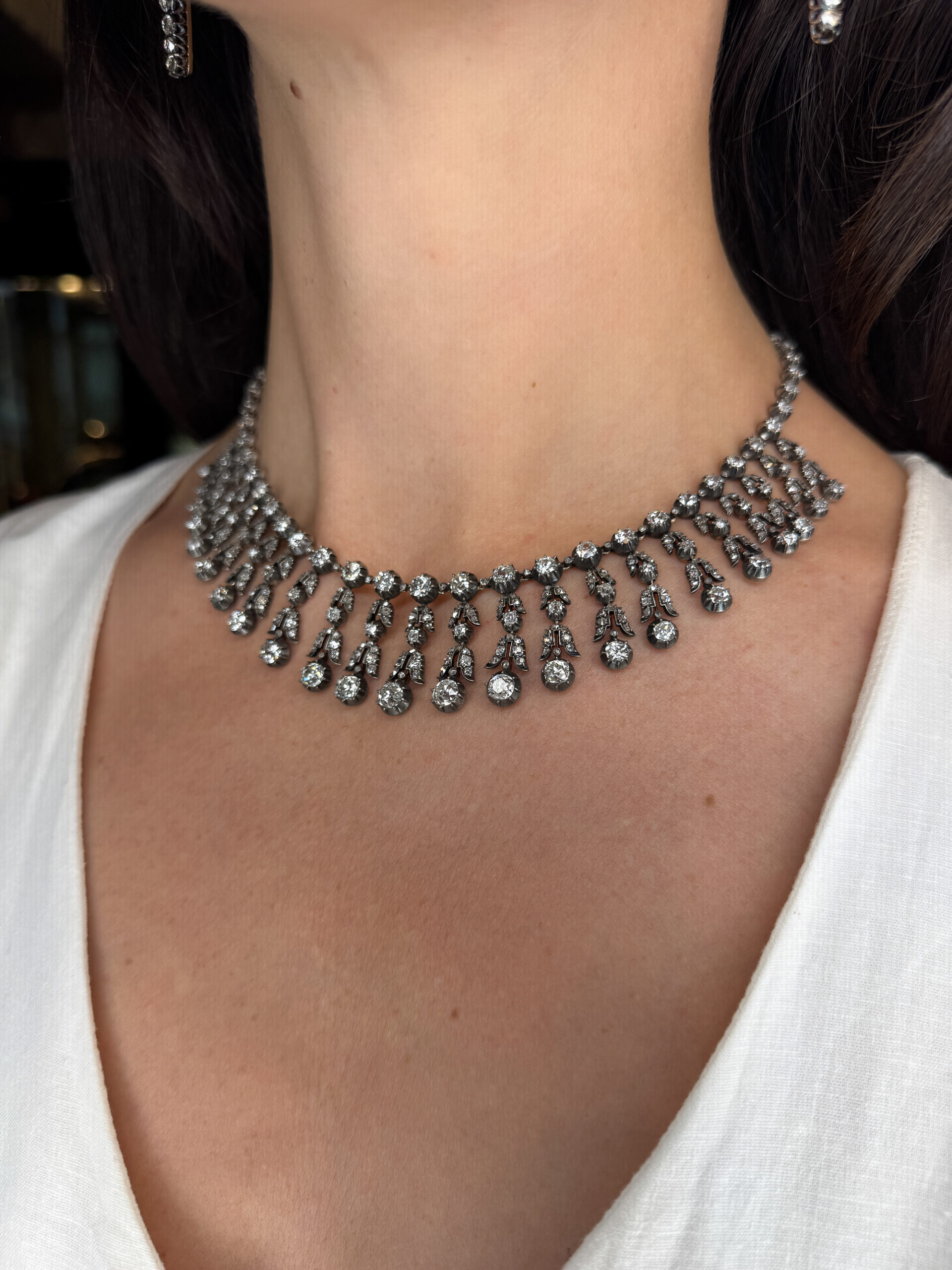 A magnificent fringe necklace composed of old cushion-shaped and rose-cut diamonds, finely mounted in silver and gold, bearing French assay marks and a maker’s mark. The necklace features a graceful graduated fringe design, each pendant delicately articulated for movement and brilliance. Accompanied by a pair of antique bar Earrings, each set with a line of rose-cut diamonds in matching silver and gold mounts, offering a cohesive complement to the necklace.