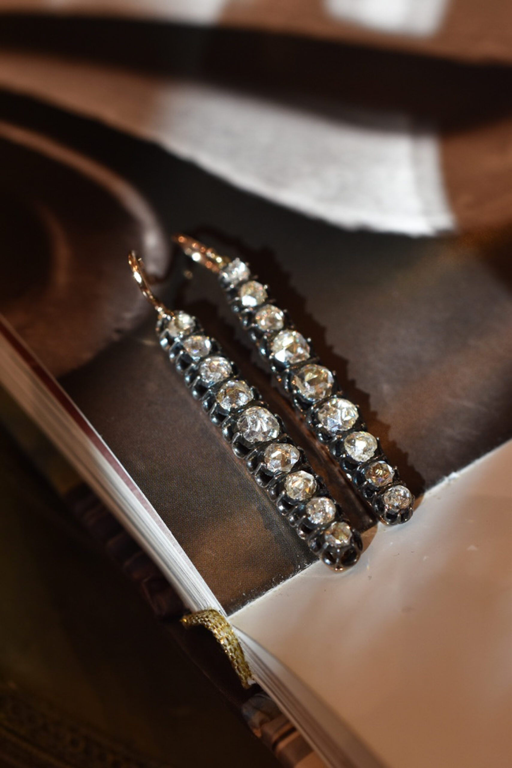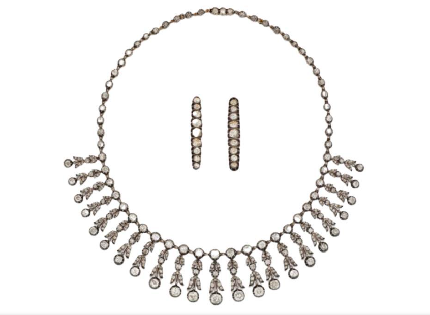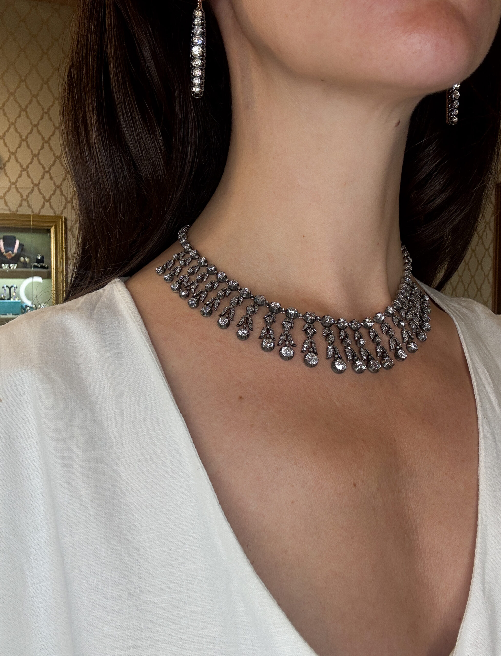 A magnificent fringe necklace composed of old cushion-shaped and rose-cut diamonds, finely mounted in silver and gold, bearing French assay marks and a maker’s mark. The necklace features a graceful graduated fringe design, each pendant delicately articulated for movement and brilliance. Accompanied by a pair of antique bar Earrings, each set with a line of rose-cut diamonds in matching silver and gold mounts, offering a cohesive complement to the necklace.