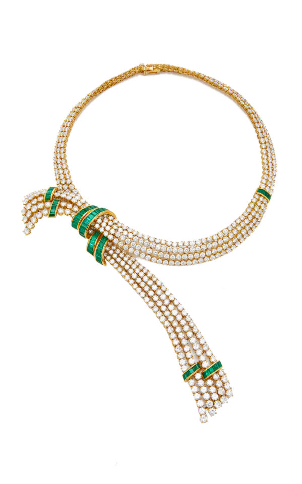 An exceptional emerald and diamonds necklace by Gerard gracefully draping around the neck with brilliant-cut diamonds and emerald accents. With matching earrings, bracelet and ring. Made in France, circa 1970